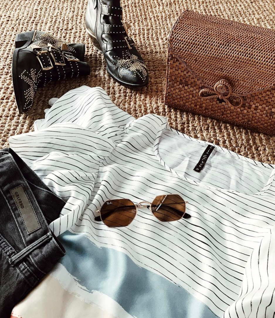 Source: Julia Comil – Sunglasses: Velvet Eyewear / Sandals: Banana Republic / Circle rattan bag: J.Crew / Over the shoulder striped blouse: Bailey 44