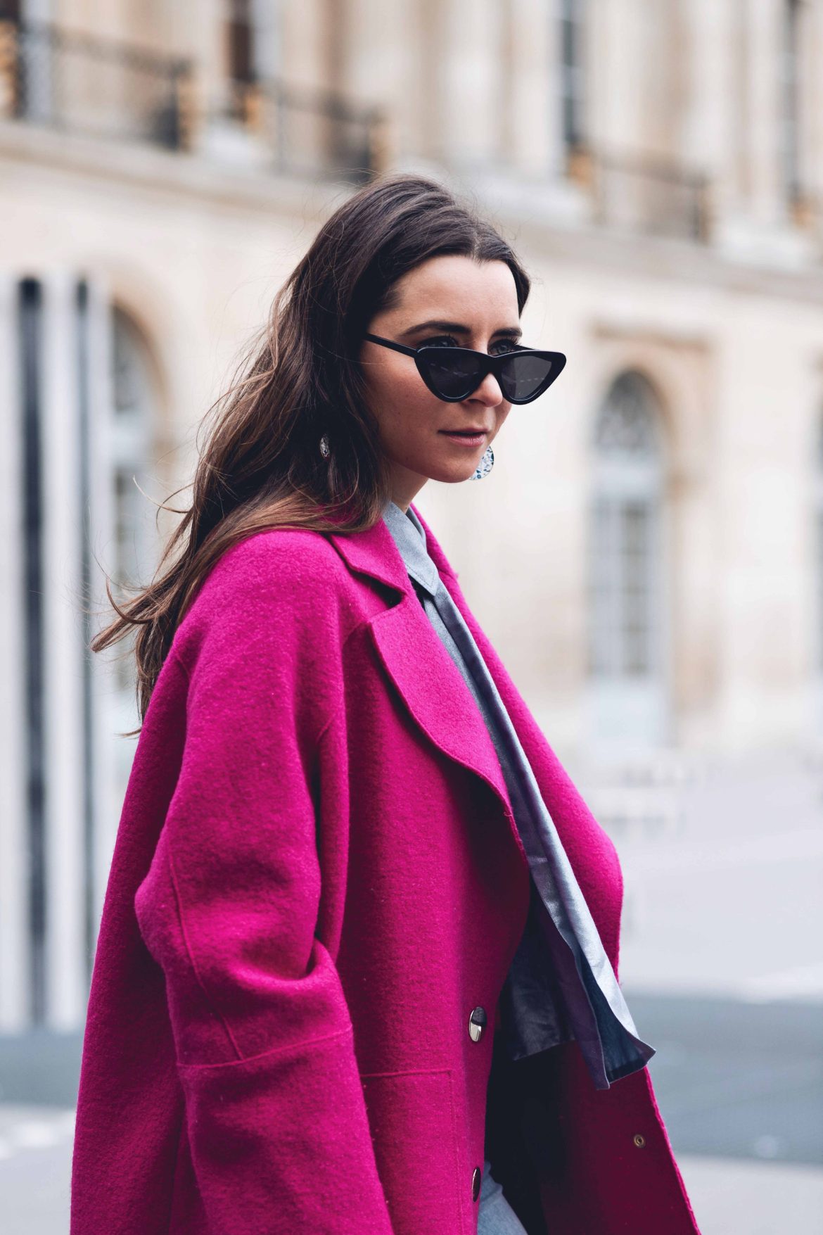 In Paris, I see “La Vie en Rose”. So for this show, I was wearing a stunning pink coat and blue metallic blouse by Tara Jarmon, denim pants by The Kooples and chevron MC nano bag by Strathberry (check out this post for more info about this beautiful Strathberry bag).